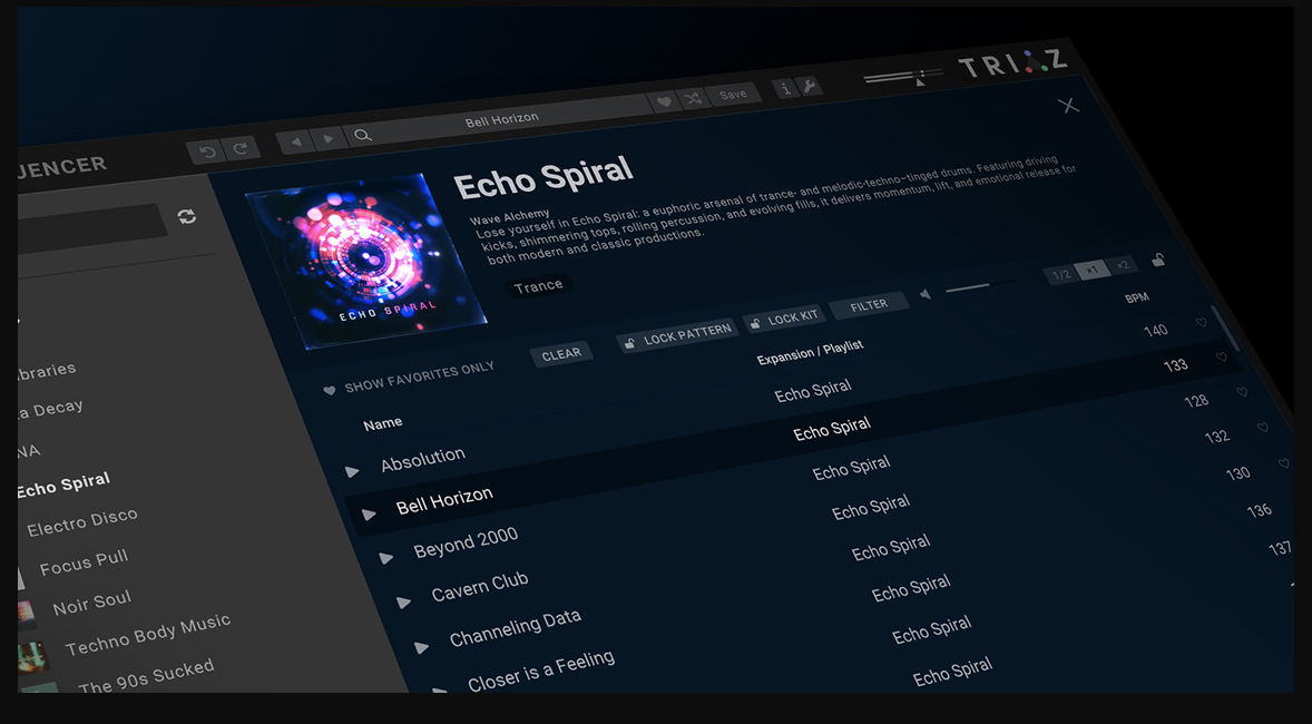 Echo Spiral is a Triaz / Triaz Player Expansion, featuring 598 drum samples and 80 finely crafted Triaz / Triaz Player presets and rhythms.