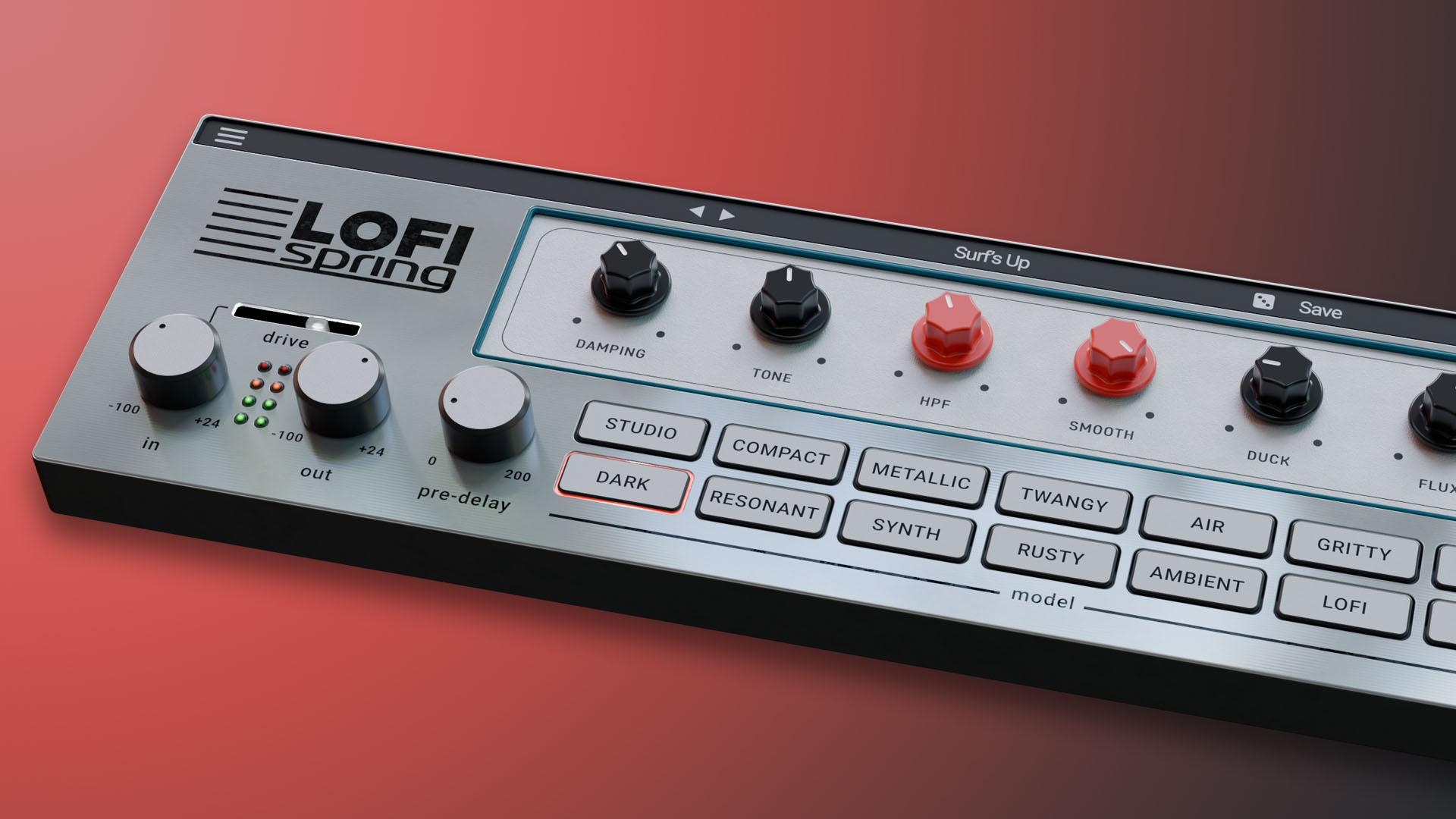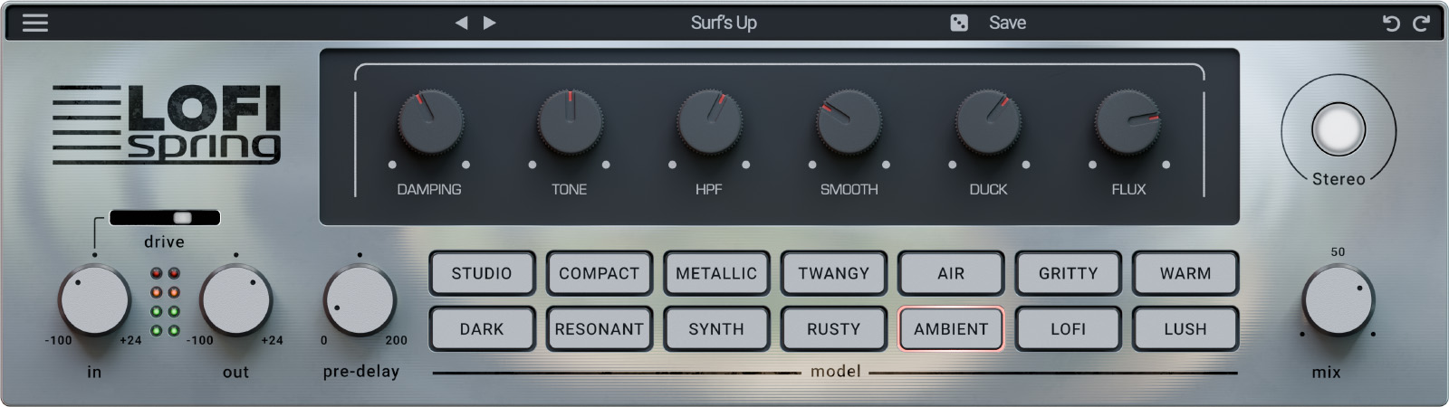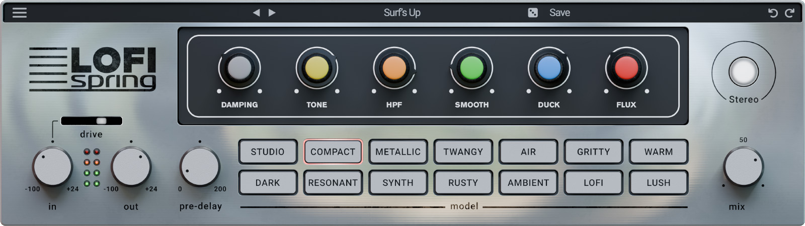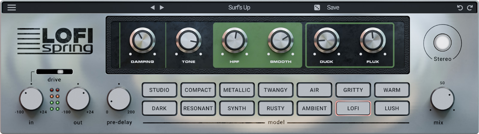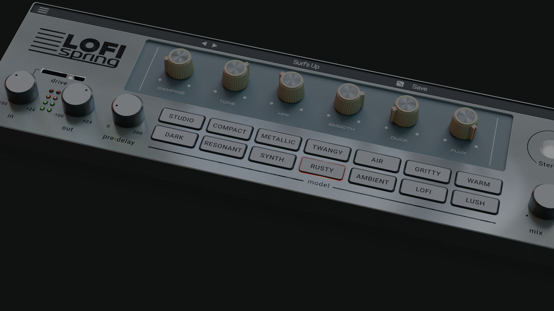 Lofi Spring’s intuitive interface puts all controls within easy reach – reverb tank selection, tone shaping, and modulation – without distracting menus or complex routing.
