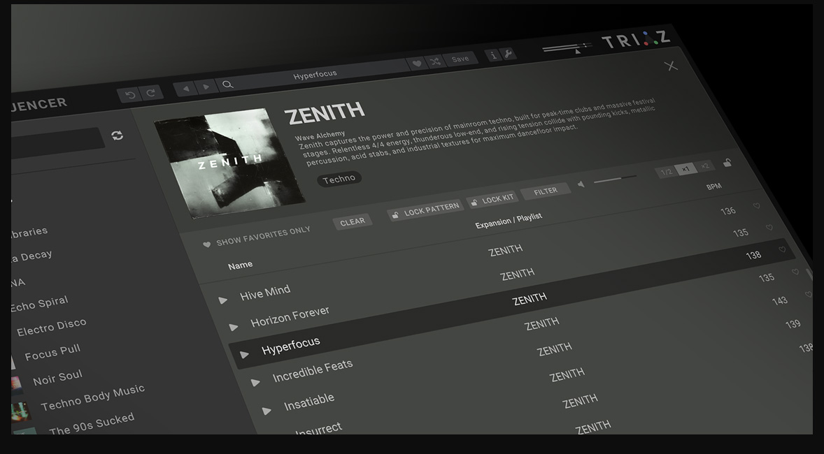 Zenith is a Triaz / Triaz Player Expansion, featuring 550 drum samples and 80 finely crafted Triaz / Triaz Player presets and rhythms.